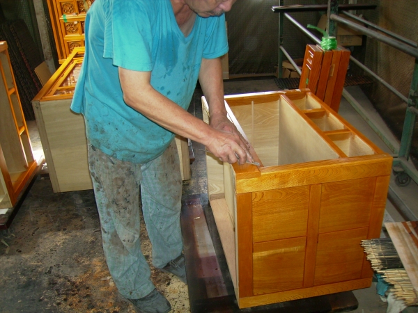 お仏壇の扉、内部小物、彫刻など、一つ一つのパーツを点検し、慎重に組立を行ないます。又、キズが無いか再度点検しながら厳重に梱包を行ないます。