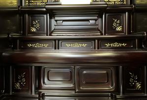 18巾「春風」紫檀調 定価44万円〈税込〉 厚塗りで艶のある仕上げの紫檀調唐木仏壇。四君子円窓障子と内部透かし彫りが豪華な造りになっています。最後の1台、お早めにご予約下さい。 現品特価158000円〈税込〉! ※静岡県内配送、据付サービス 寸法‥(高さ)1540(間口)620(奥行)540mm 台輪、戸軸、戸板‥調プリント